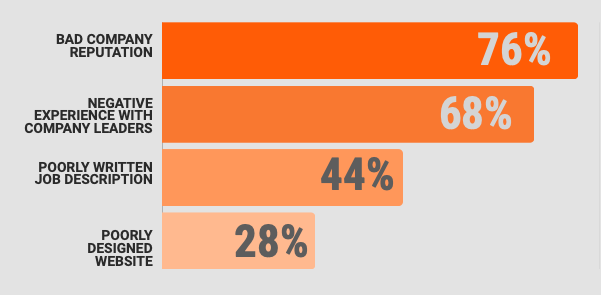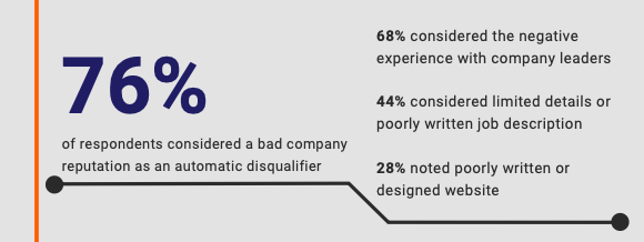 - 76 percent of candidates consider a bad company reputation an automatic disqualifier, often before submitting an application.