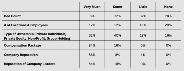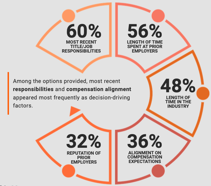 What This Means: Candidates care far more about who leads the organization, how the organization is perceived and whether compensation aligns with expectations. Leadership credibility and compensation outweigh organizational scale.