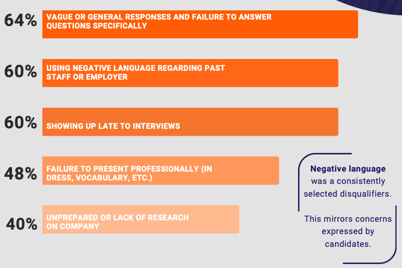 Most common interview disqualifiers were speaking negatively about current or former staff and perceived misalignment in ethics and values. Speaking negatively about staff appeared more frequently than interviewer lateness, signaling how seriously candidates view professionalism and culture.